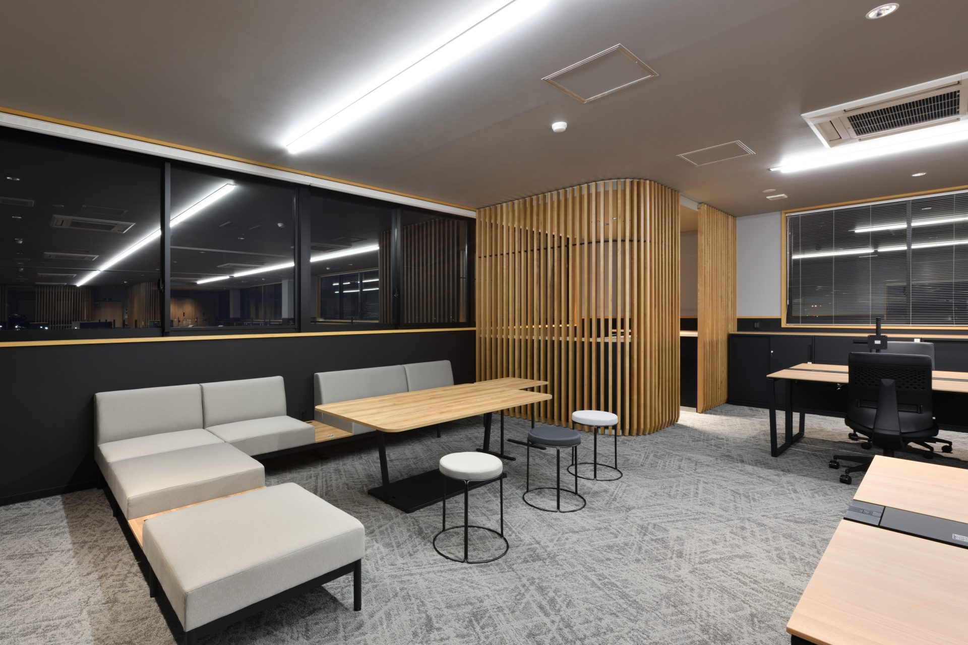 外観は黒を基調とし、内照サインや生き生きと働くスタッフの皆様が引き立つ背景として、落ち着きと温かみを併せ持つ、働きやすい環境を目指しました。内装では電気・ラインをモチーフに、照明やルーバーによって空間にリズムを与えています。オープンで活発なコミュニケーションを促しつつ、経理部門などプライバシーが求められるエリアでも閉じすぎない設えとし、全体のバランスに配慮しました。